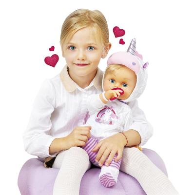 Cicciobello si è trasformato in un Unicorno magico, i suoi capelli biondi sono nascosti dal cappuccio della suo morbida tutina. Come un vero bebè senza il ciuccio Cicciobello piange!