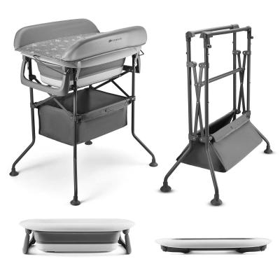 Multifunzione – possibilità di 5 configurazioni: solo vaschetta, vaschetta su struttura, vaschetta con fasciatoio su struttura, fasciatoio su struttura e appeso lateralmente Cambio facile da vaschetta a fasciatoio Chiusura piatta della vaschetta grazie alla parte in silicone e struttura compatta Struttura stabile con piedini antiscivolo Scarico con tubo lungo – 151 cm Cestino porta-accessori