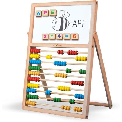 Un colorato abaco in legno, una lavagna scrivi e cancella e tanti magneti per insegnare ai piccoli lettere, parole, numeri e logica con l’aiuto delle simpatiche schede! E sul retro… la classica lavagna di gesso per