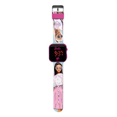 Orologio a LED di Barbie con quadrante stampato, cassa in plastica argentata, display digitale rosso illuminato, data e divertente design stampato del cinturino con chiusura tradizionale a fibbia. Funzione oraria 12 ore e data completa.