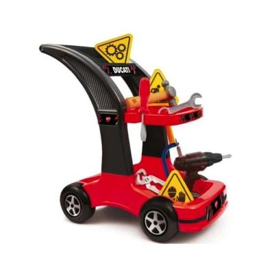 Questo robusto e colorato carrello officina giocattolo include tanti attrezzi realistici per svitare, montare e costruire in sicurezza.