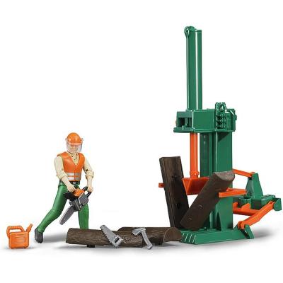 La fornitura comprende la figura di bworld, quattro tronchi, un'ascia, la tanica di benzina, l'elmetto con visiera, la motosega, la sega, il gilet ad alta visibilità e un ambiente di gioco completo composto da uno spaccalegna Posch
