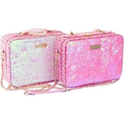 Elegante valigetta con tessuto tweed e paillettes reversibili. All'interno un ricco set per makeup, applicatori, accessori e uno specchio. Provvista di tracolla, maniglia in finta pelle e maniglia in perle.