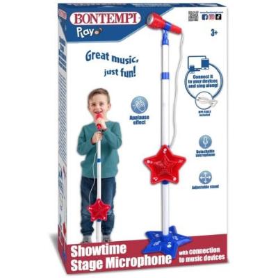 Microfono da palcoscenico Asta regolabile in altezza 10 brani preregistrati Regolazione del volume Effetto applausi Connessione ad un lettore di MP3, (smartphone, iPod, CD player...), cavetto incluso Effetti luminosi Alim.: 3 batterie da 1,5V R6/AA (non fornite) Dim.: 200x200x1000 mm
