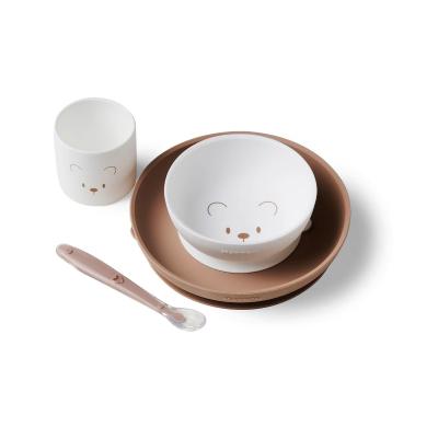 Per i piccoli buongustai: con l'elegante set di stoviglie bianco & talpa con orsetto stampato in silicone, genitori e figli possono mangiare e godersi. la reciproca compagnia senza preoccupazioni.